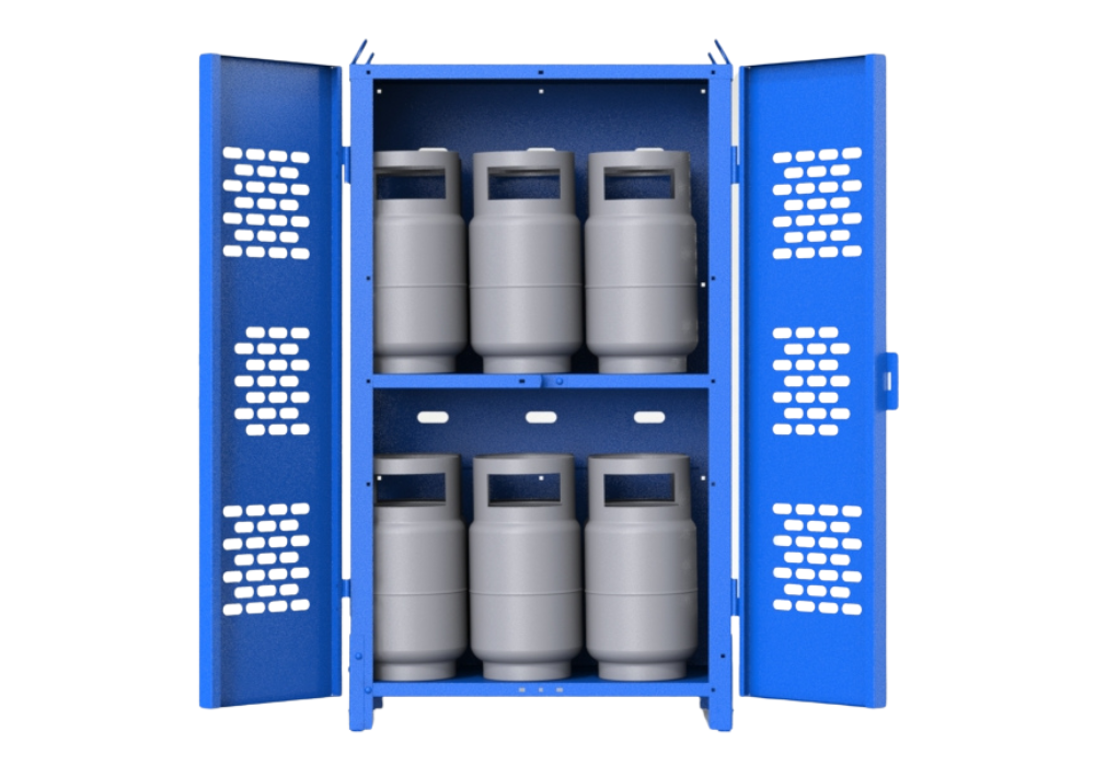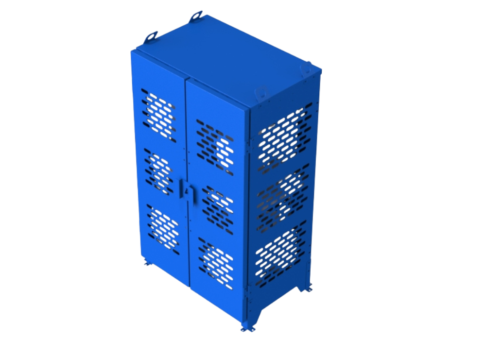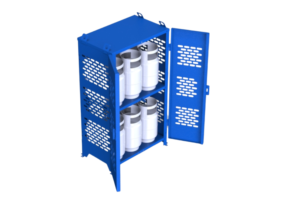 The 12-Cylinder Sheet Cage is built to hold up to twelve 33 lbs cylinders securely. With dimensions of 41″W x 27″D x 72″H, this cage is constructed from robust 14-gauge steel sheets, ensuring reliable protection and durability. Its spacious design allows for optimal use in industrial and commercial settings where secure and organized cylinder storage is necessary. The strong steel sheet construction guarantees the safe containment of cylinders while providing easy access and inspection.