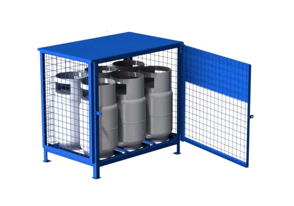 The 6-Cylinder Mesh Cage is designed to securely hold up to six 33 lbs propane tanks. With dimensions of 41W X 27D X 38H , this cage is constructed from sturdy 11-gauge steel and features a mesh design that allows for optimal ventilation and visibility. Its strong construction ensures durability and safety, making it ideal for industrial and commercial use. The mesh design facilitates easy inspection and access while providing reliable containment for the propane tanks.